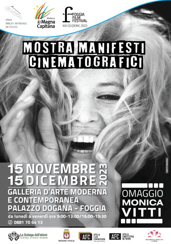 In questa XIII edizione 2023, presso LA GALLERIA D’ARTE MODERNA E CONTEMPORANEA , si rende OMAGGIO A MONICA VITTI con la MOSTRA DI MANIFESTI CINEMATOGRAFICI, la visione di materiale audiovisivo, incontri, conversazioni con esperti e addetti ai lavori, a cura de Biblioteca “La Magna Capitana” di Foggia.